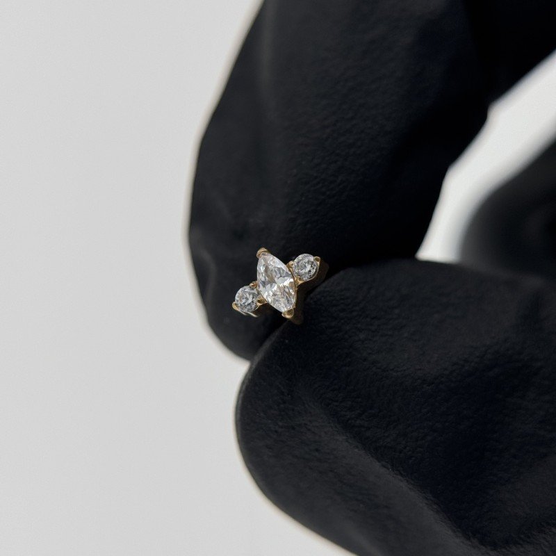 Piercing de titanio ASTMF-136 con baño de oro de 24 Kt. PVD. Con 3 zirconias premium. 2 corte brillante y 1 corte marquesa.
